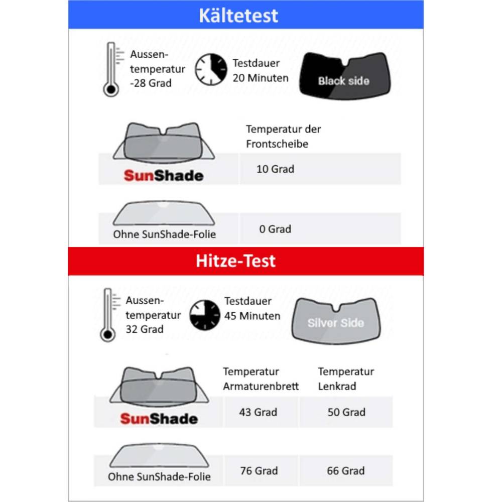 Dies dient dazu, dass Sie die Sunshades im Sommer so wie auch im Winter nutzen können. Im Sommer werden die Sonnenstrahlen von der silbernen Seite reflektiert und das Fahrzeug wird kühl gehalten.
